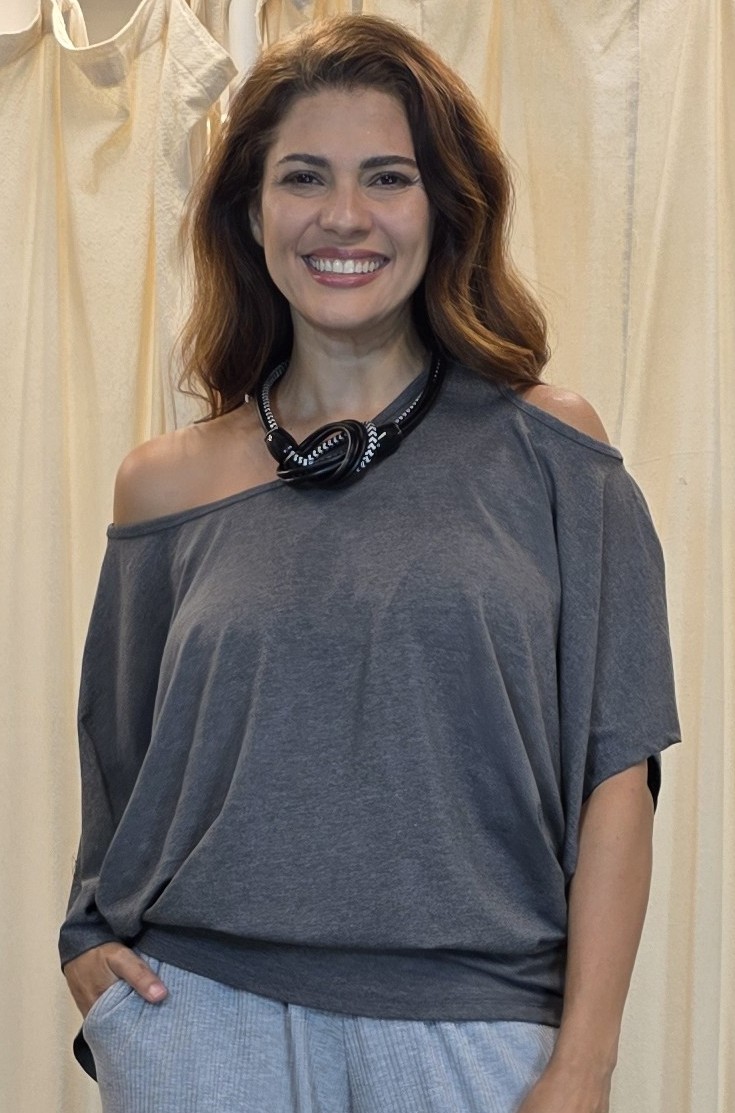 Modelo: Morcego, gola canoa e detalhe vazado no ombro esquerdo.
